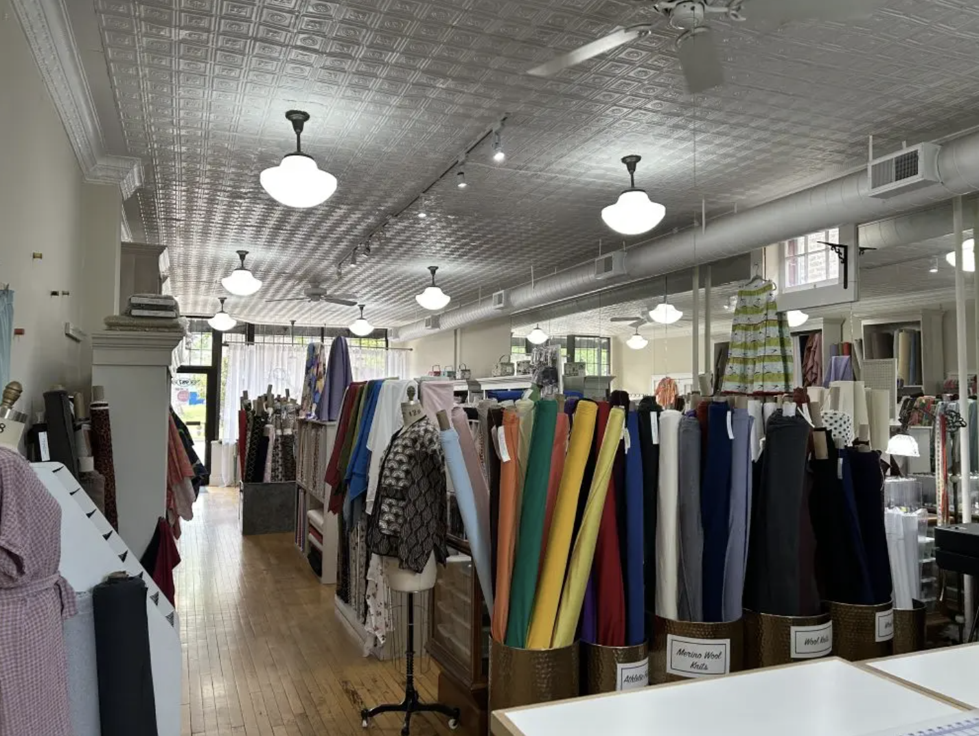 A large alcove of notions and tools, drawers filled with colorful spools of thread in every imaginable shade. The widest selection of rare and unique buttons in every size and material, alongside packets of zippers and needles of all gauges.